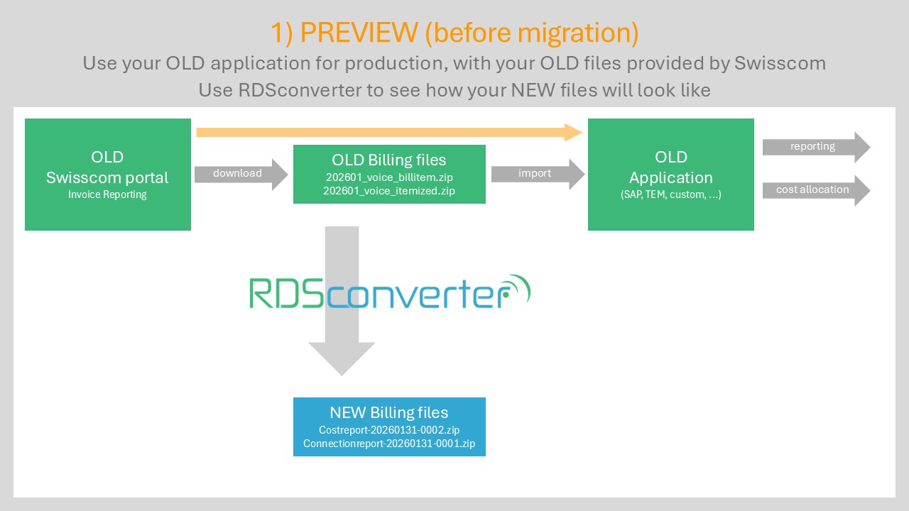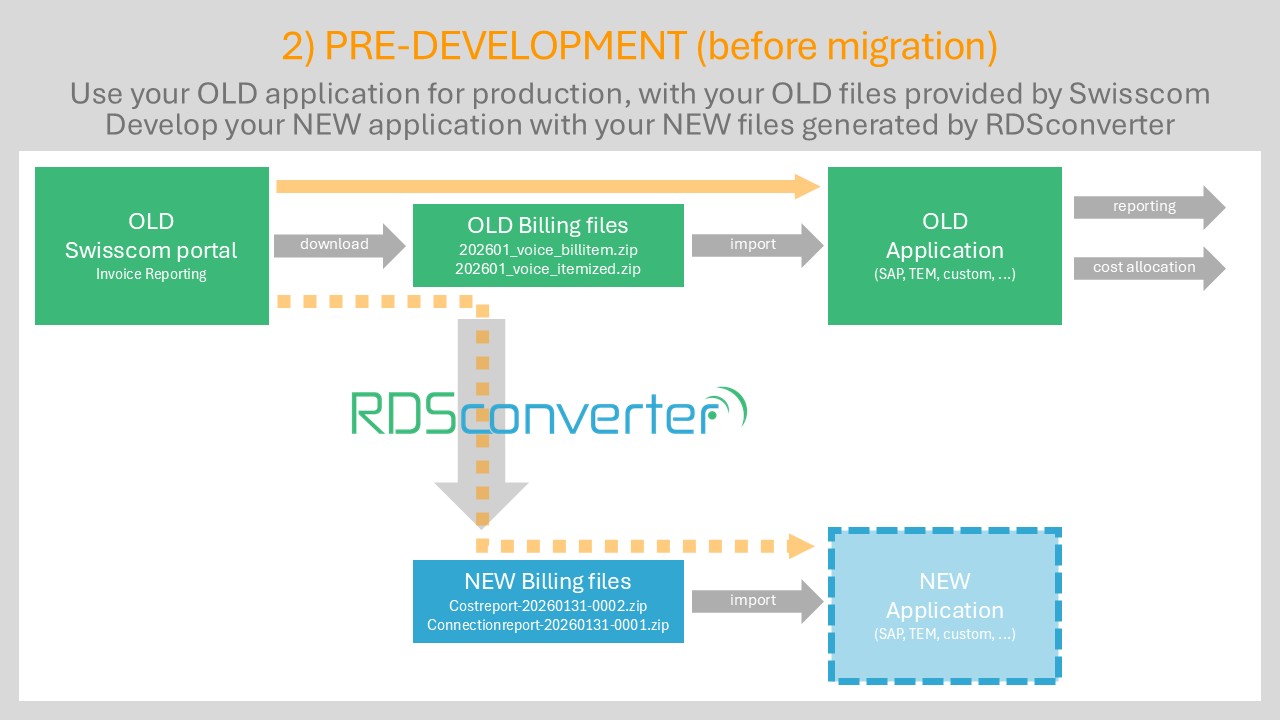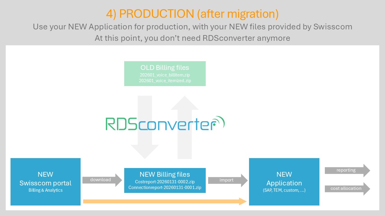 From the moment you get migrated, you will receive the new files only. With RDSconverter, you can continue using your old application in case you need more time for your development or if you experience any problem with the new files provided by Swisscom.